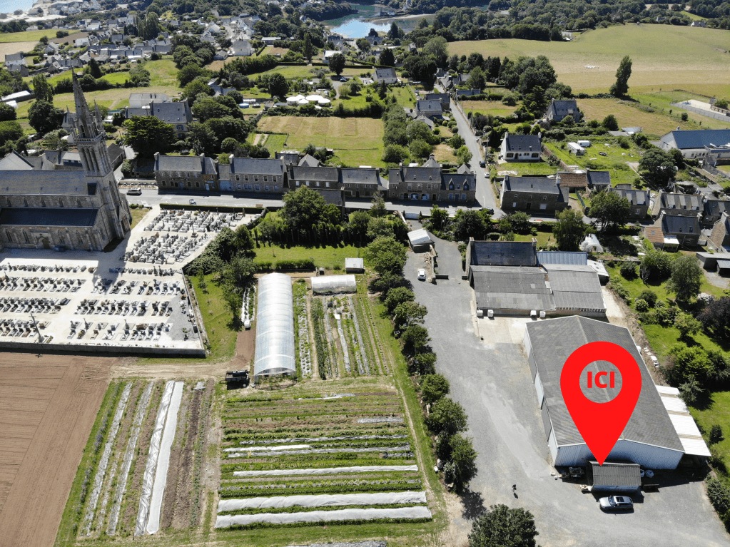 Tourner entre les chicanes au niveau du salon de coiffure, puis prendre la première à droite « Résidence Penn Allé » 100 m plus loin, puis rentrer dans la ferme 50 m plus loin sur la droite au niveau des grands hangars blanc.