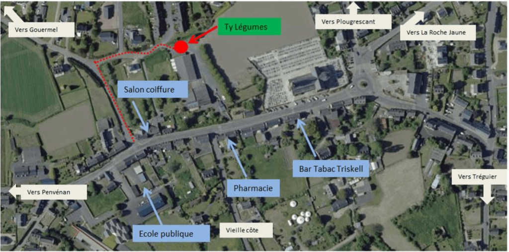 L’accès à la ferme se fait via le bourg de Plouguiel.