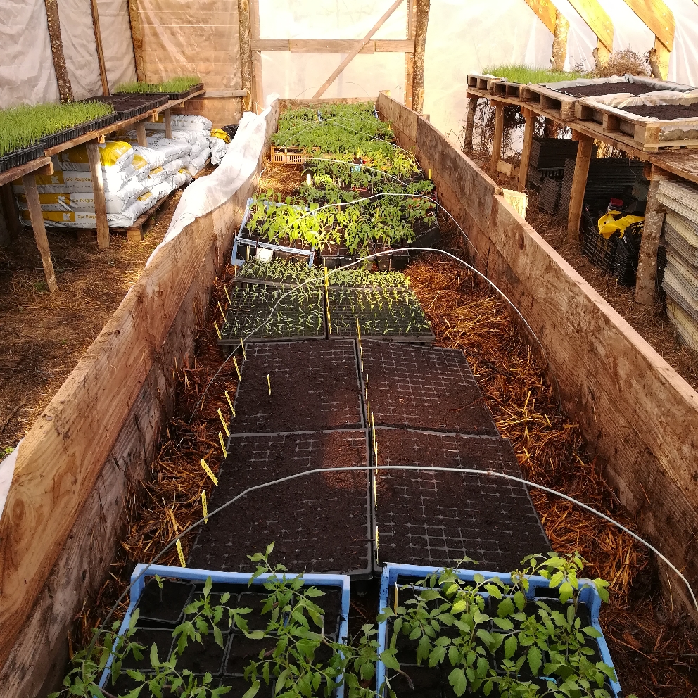 Par exemple, pour chauffer nos semis en Février, nous n’utilisons pas d’électricité mais une couche chauffante organique. Le principe consiste à broyer des feuilles, de l’herbe des branches etc et de maintenir le broyat dans un caisson d’au moins 1m cube. La matière organique fraichement broyée va chauffer pendant plusieurs semaine (jusqu’à 100 degrés à l’intérieur). On pose ensuite nos caisses de semis sur le tas du broyat avec un voile par dessus pour retenir la chaleur.