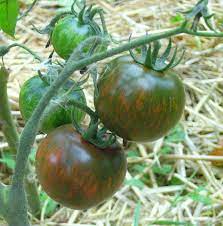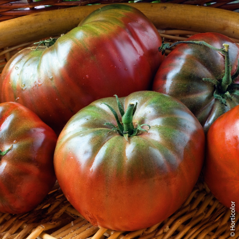 variété de mi-saison à tardive, fruits de 120-150 g mais pouvant atteindre 500 g! Côtelés, légèrement aplatis ces fruits sont à chair rouge sombre. Chair dense, douce et sucrée, pourpre foncé, contenant peu de graines (sans acidité). La tomate préférée des enfants !