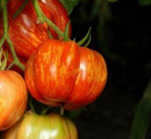 Magnifique tomate ronde jaune orangé striée de vert, prenant une teinte rose à maturité. Fruit de 200 g. La chair est couleur rouge framboise avec plusieurs lobes. La saveur est très fruitée. La peau est mince mais elle résiste tout de même aux fendillements.